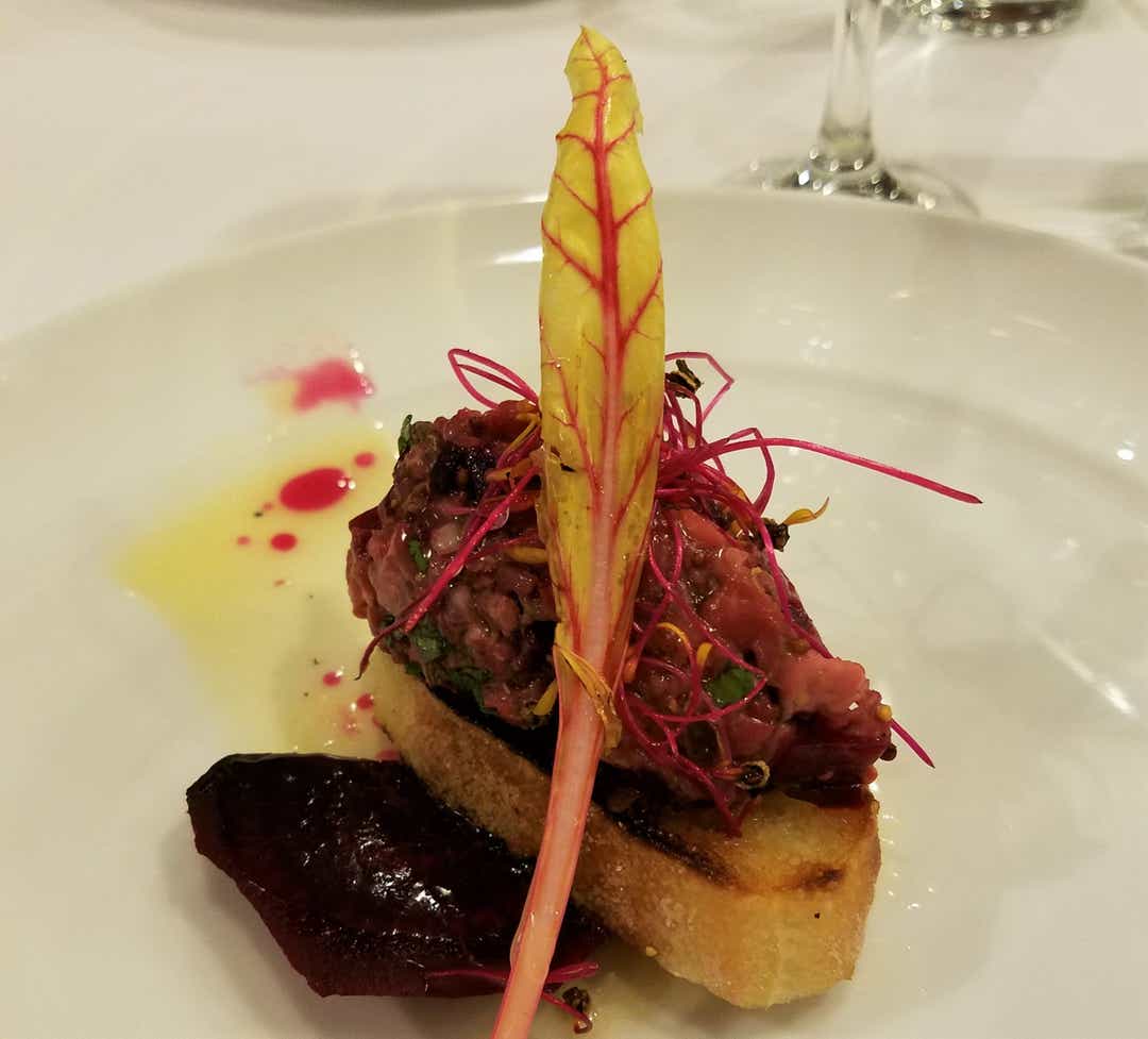 At his private chef dinners, I’ve had delicate tartare of beef, beets and capers spooned on French bread, a dish artfully arranged it stands as one of most beautiful I’ve had in Indianapolis. At a recent chef’s dinner at Rebar, Mereday served roasted sea bass laid over tiny black lentils and silky parsnip puree in a pool of intense duck broth reduction.