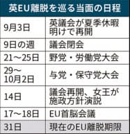 英議会は夏季休暇中で、9月3日に再開する。承認された日程では9日の週に再び閉会とし、女王の施政方針演説が設定された10月14日まで開かれない。直後の17~18日には、英国の離脱が大きな議題となるEU首脳会議が予定されている。