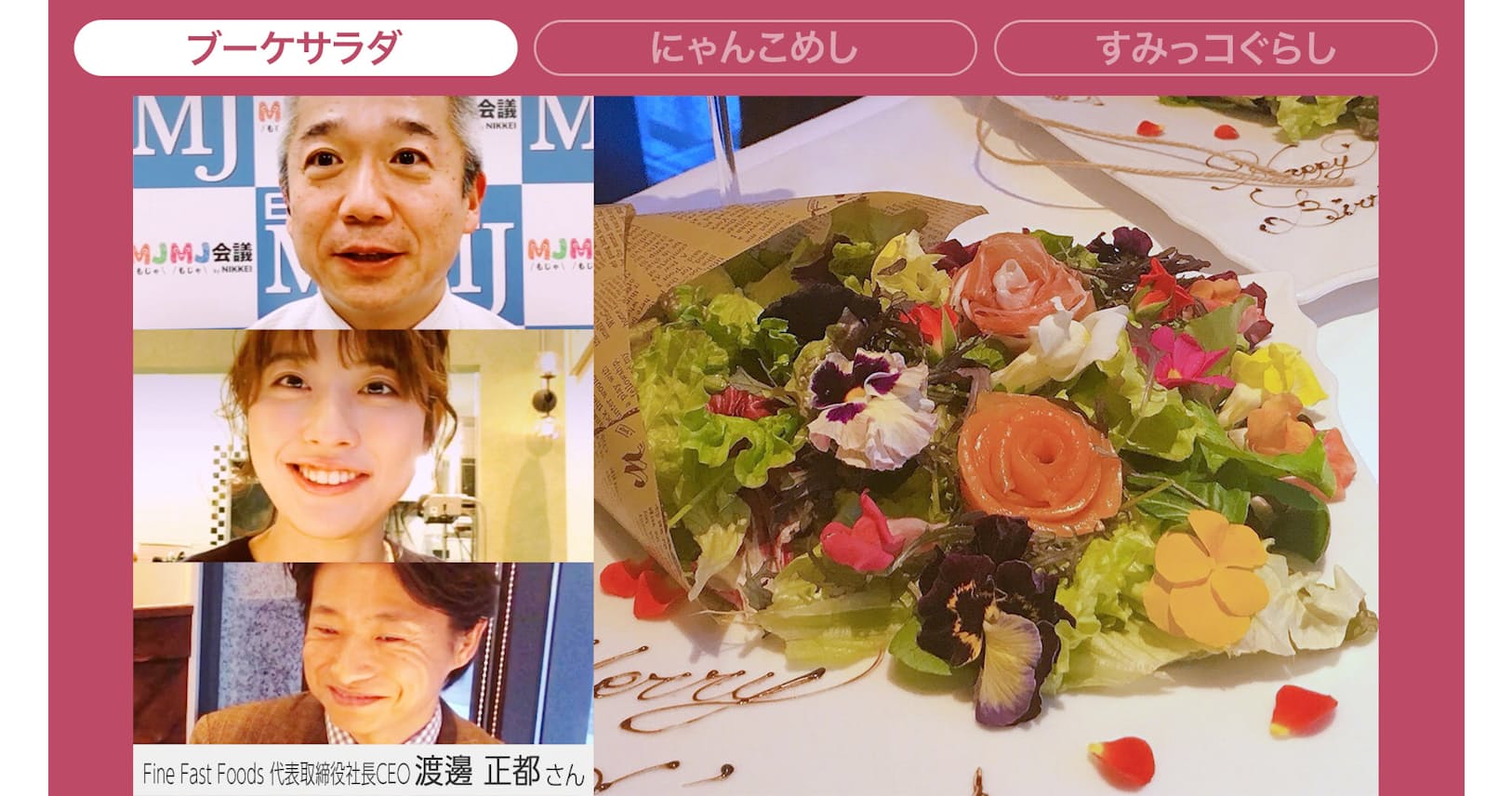 ランチもディナーも花のサラダで華やかに。日経MJを“ツマミ”に本音でトークするトレンド先取り番組「MJMJミライ会議」。ITエンジニアでタレントの池澤あやかさんとMJ編集長が最近話題の「ブーケサラダ」の魅力を紹介します。