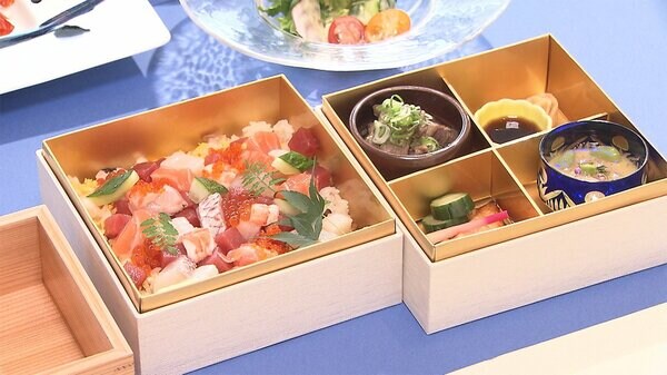 メニューは、シュリンプカレーやマグロのちらしずしなど、一見、普通の料理に見えるが、料理に使われているマグロやサーモン、タイ、エビなどには、ある共通点がある。