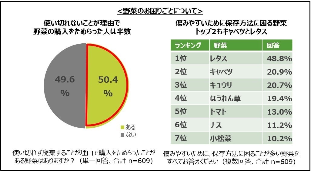 野菜を食べきれず廃棄してしまった経験があるか質問をしたところ、78.8%の人が経験をしていることが分かりました。また、「廃棄してしまうことが多い野菜」と「傷みやすいため保存に困るお困り野菜」を質問したところ、キャベツが1位、レタスが2位と並び、葉物類が上位になっています。人気である反面、お困り野菜である事実が判明しました。使いきれず廃棄してしまうことを理由に野菜の購入をためらったことがあると回答した人は50.4%となり、食べきれないことが野菜購入の弊害となっていることが分かりました。