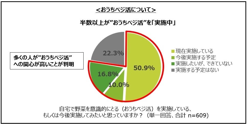 609人の回答者のうち77.6%が、自宅で野菜を意識的に摂る”おうちベジ活”を「実施している」「今後実施する予定」「実施したいができていない」のいずれかの回答をし、多くの人が”おうちベジ活”への関心が高いことがわかりました。