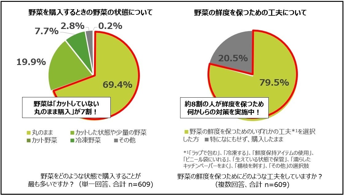 また、野菜をどのような状態で購入することが多いが質問をしたところ、「丸のまま(カットしていない状態)」と答えた人が69.5%に上りました。野菜の鮮度を保つために何かしらの工夫をしている人は79.5%となり、野菜の鮮度や鮮度保持への意識の高さがうかがえました。