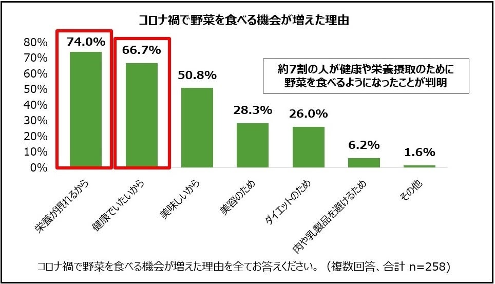 コロナ禍で自宅で野菜を食べる機会が増えたか質問をしたところ、「増えた」「やや増えた」の回答は合計42.4%で、自宅で野菜を摂取するようになった人が増加している実態が明らかになりました。また、コロナ禍で野菜を食べる機会が「増えた」「やや増えた」と回答した258人に対して、増えた理由を質問したところ、「栄養が摂れるから」と回答した人は74%、「健康でいたいから」と回答した人は66.7%となり、多くの人が健康や栄養摂取のために意識的に野菜を食べるようになったことが分かりました。