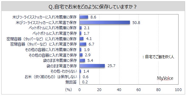 ■自宅で食べるご飯は「お米を研いで炊く」が8割強、「無洗米を使って研がずに炊く」が2割弱。お米の保存方法は「米びつ・ライスストッカーに入れ常温で保存」がご飯を炊く人の5割強、「袋のまま常温で保存」が約26%