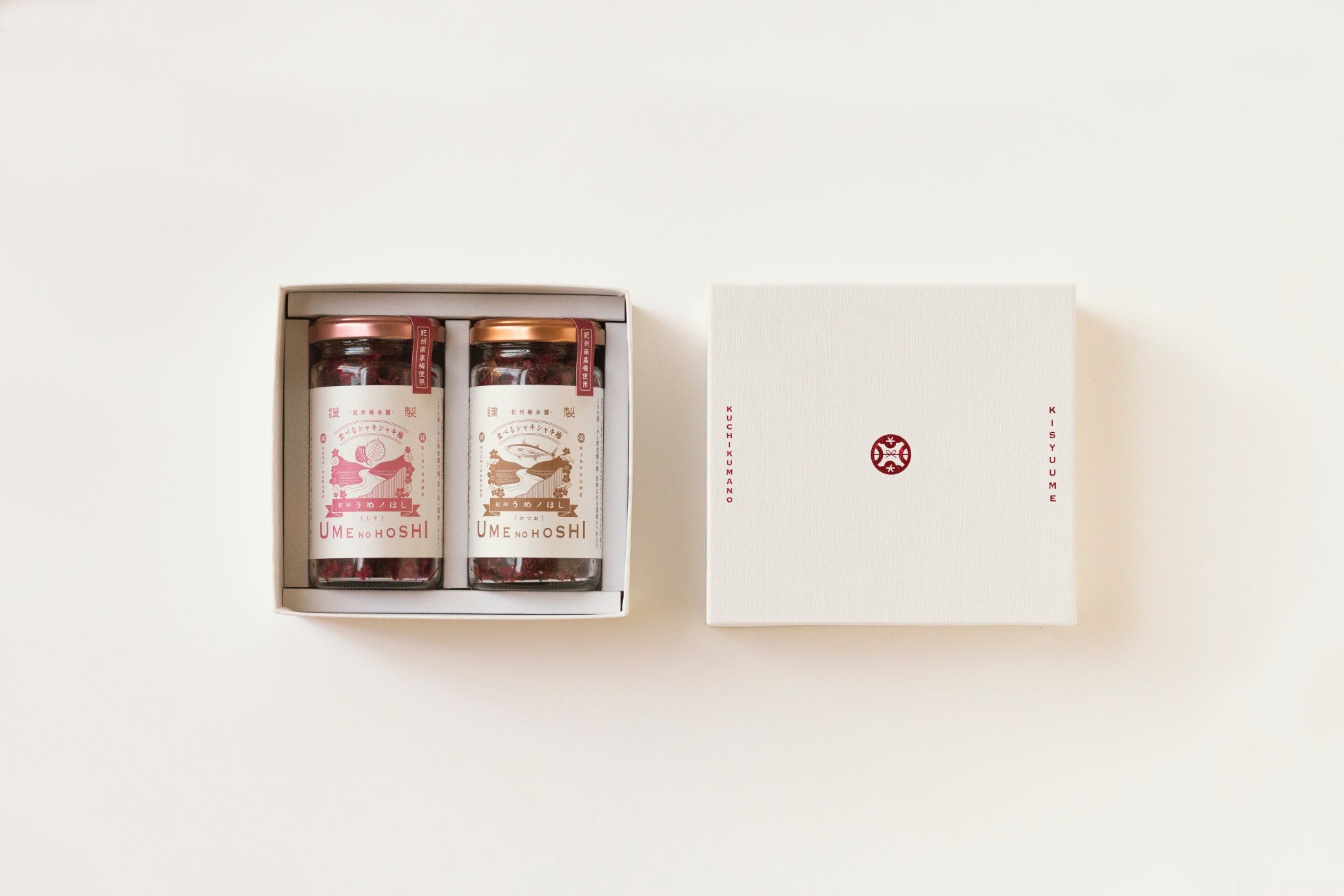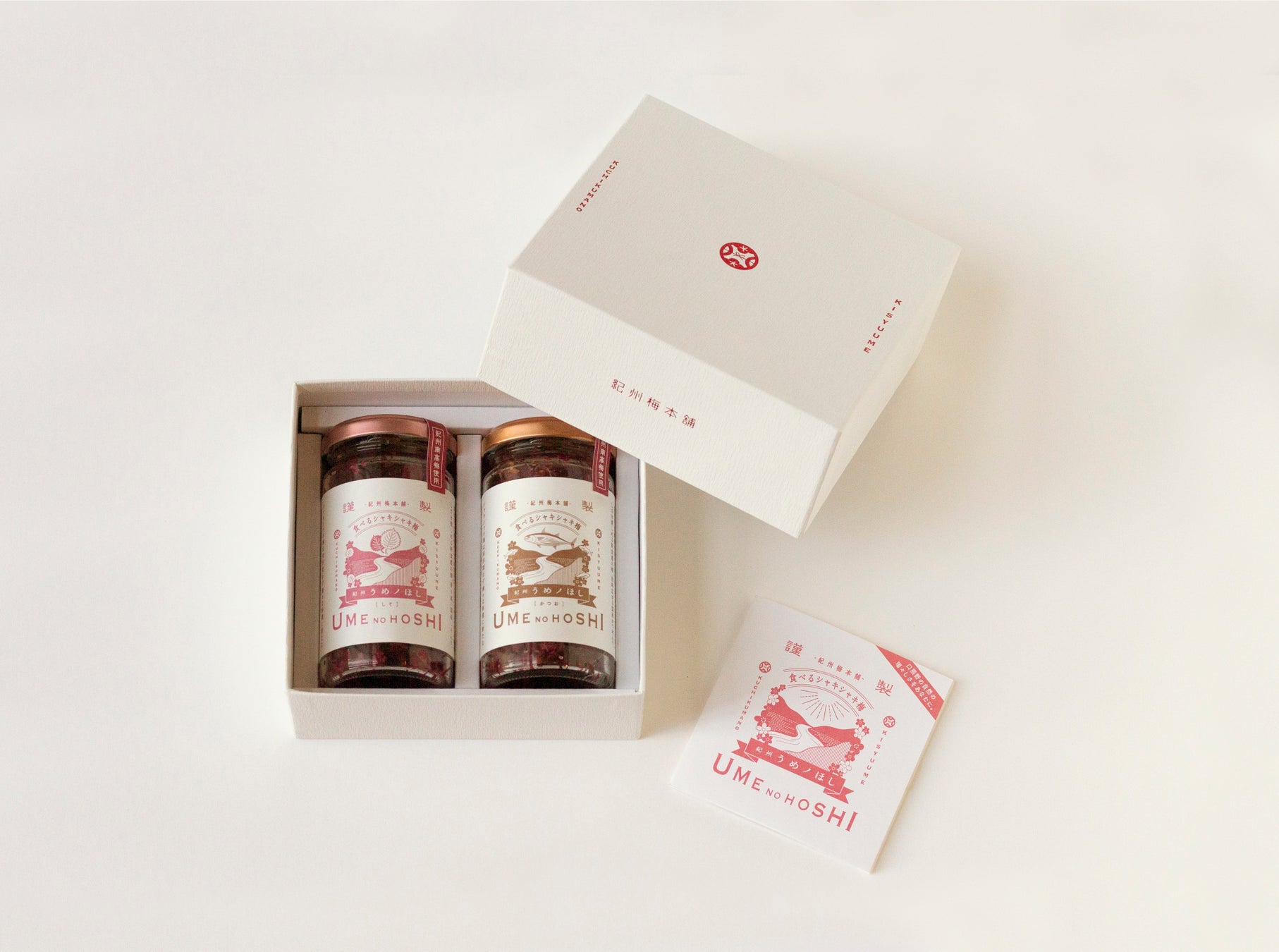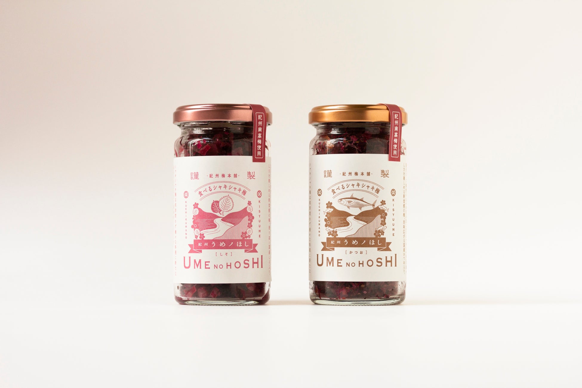 「食べるシャキシャキ梅 紀州うめノほし」は、直接木から採った青梅を漬け込むことで柔らかい梅干にはないシャキシャキとした食感を残しさまざまなバリエーションの料理を楽しむことが出来る梅製品となります。味はしそ味とかつお味の2種類をご準備。活用法は多種多様あり、サラダとしてあえるだけでなく、パスタと一緒に合わせて食べることができます。調味料という面では、本商品をタルタルソースに混ぜることで、タルタルソース本来の酸味と、梅の酸味が合わさり、フライものでも軽い食感で味わうことができる梅風味のソースになります。商品のパッケージは世界遺産熊野古道のふもと富田川をイラストとして表現。贈答箱は大切な人へのギフトとして使用していただくため、高級感漂う風合いのある和紙に“梅”カラーである赤い箔押しが施されております。