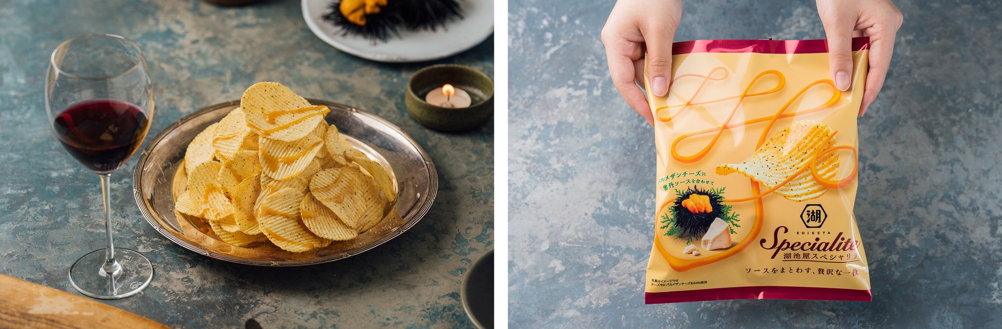 「スペシャリテ」とは、フランス料理において、その店のシェフが最も得意とする一皿のことです。日本のポテトチップスの老舗として、これまでとは違うポテトチップスの美味しい食べ方をご提案したいという想いから、じゃがいもの味わいを活かすパルメザンチーズ味のポテトチップスに、贅沢な味わいの雲丹(うに)ソースをまとわせて食べる、湖池屋の「スペシャリテ」と呼ぶに相応しい一品が誕生しました。