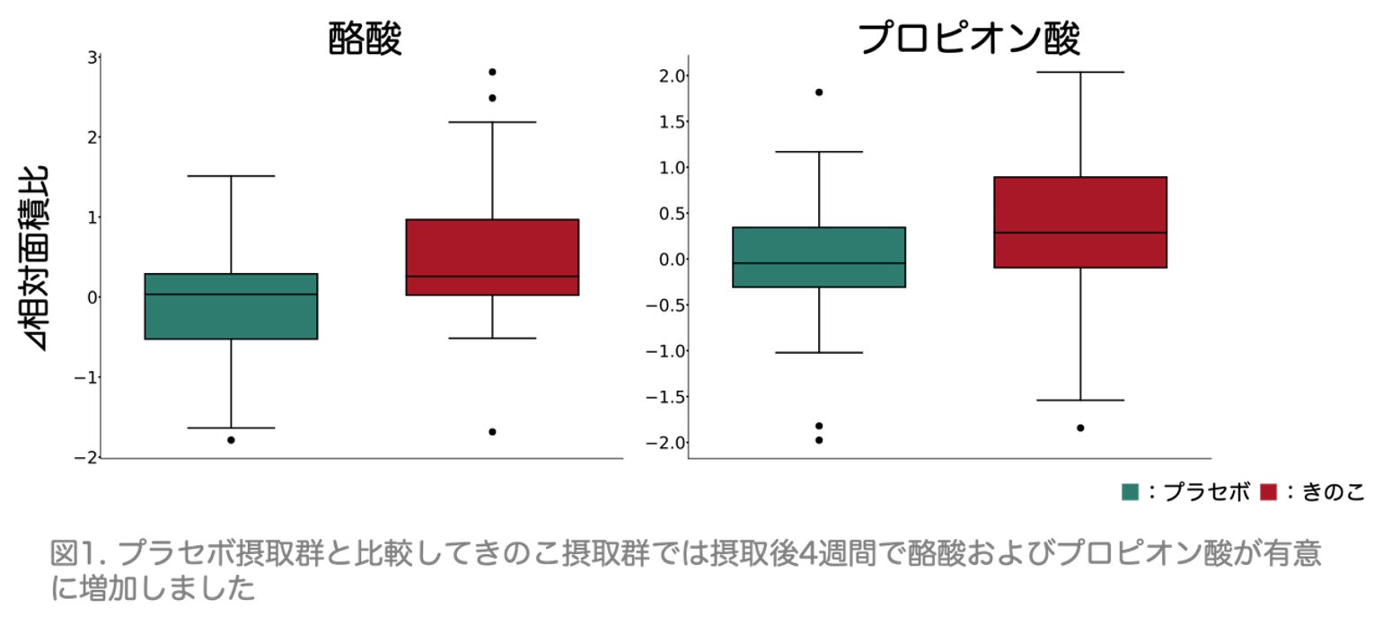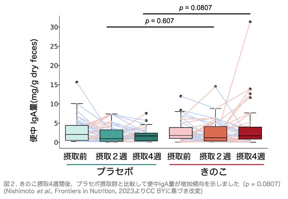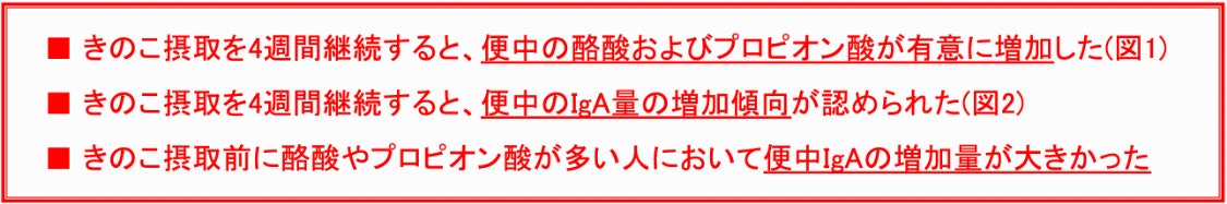 他にも、きのこ摂取によって便中の酪酸およびプロピオン酸が増えたことと、きのこ摂取前にこれらの短鎖脂肪酸が多い人において便中IgAの増加量が大きかったことから、きのこを長期的に摂取することでより多くの人で便中のIgAが増加する可能性が考えられます。