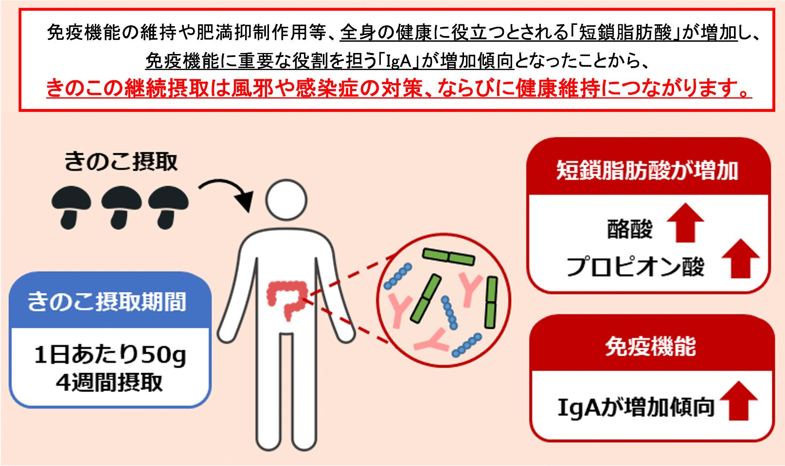 きのこはβグルカンをはじめとする食物繊維が豊富な食品で、これまでにも腸内環境を改善することによる抗肥満効果などの健康効果が報告されてきました。そこで、きのこ摂取が腸内環境および感染予防に及ぼす影響を臨床試験によって評価するために、共同研究を実施しました。