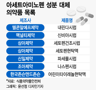 23일 식품의약품안전처에 따르면 챔프·콜대원키즈펜시럽을 대체할 아세트아미노펜 성분의 시럽·현탁제는 텔콘알에프제약의 '내린다시럽', 맥널티제약 '신비아시럽', 삼아제약 '세토펜건조시럽'과 '세토펜현탁액', 신일제약 '파세몰시럽', 조아제약 '나스펜시럽, 한국존슨앤드존슨의 '어린이타이레놀현탁액' 등 모두 7종이다. 이 중 세토펜현탁액은 의사의 처방을 받아 쓰는 전문의약품(조제용)으로도 판매된다.