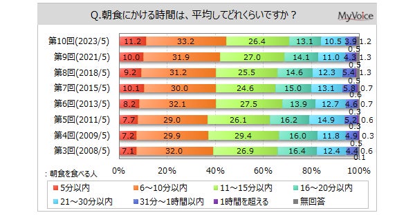 朝食にかける時間は、「6~10分以内」「11~15分以内」がボリュームゾーンです。10分以内に食べる人は朝食を食べる人の4割強、男性30~50代では各6割弱となっています。