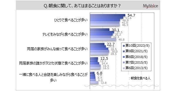 朝食を食べる人に、朝食に関してあてはまると思うことを選んでもらいました(複数回答)。「ひとりで食べることが多い」が54.7%、「テレビをみながら食べることが多い」が30.1%です。続く「同居の家族がみんな揃って食べることが多い」は22.7%、2018年以降減少傾向です。