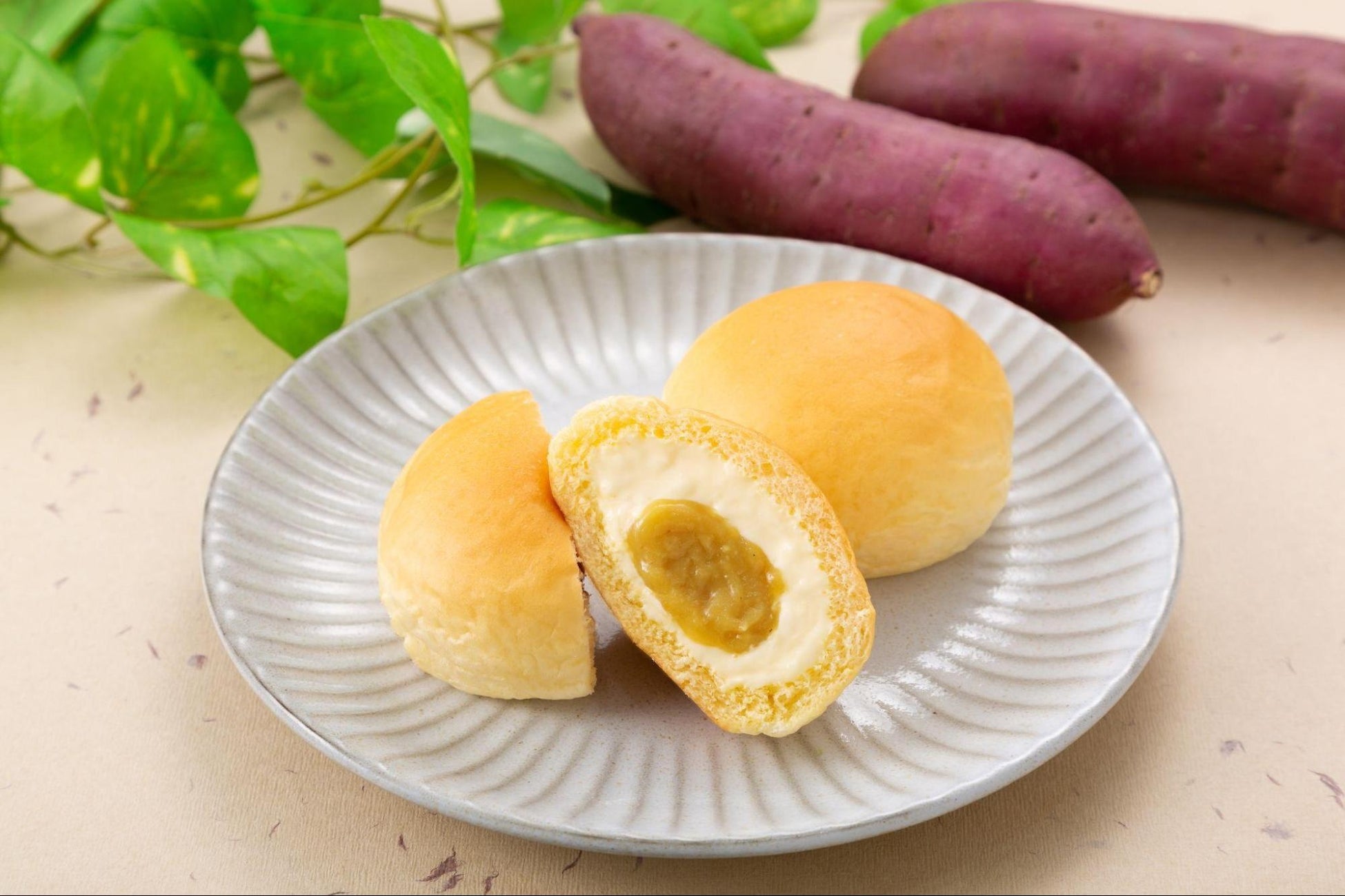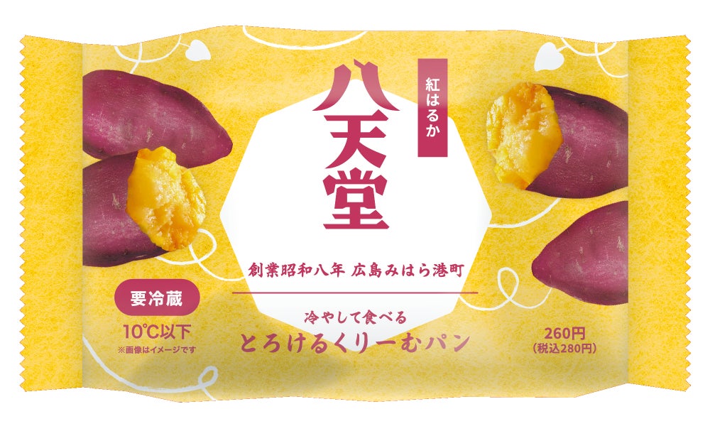 秋に収穫を迎える数あるさつまいもの品種から、強い甘みにも関わらず後味がスッキリした上品な甘さを持つ鹿児島県産の「紅はるか」を使用。さらに、加工方法も焼き芋・蒸し芋と様々な試作を行い、その中で最もくりーむパンとの相性が良かった「焼き芋ペースト」を採用しました。軽くてくちどけの良いカスタードクリームと紅はるかのフィリングをふんわり柔らかなパンに2層仕立てで入れたくりーむパンは、秋の到来を感じるやさしい味わいに仕上がっています。