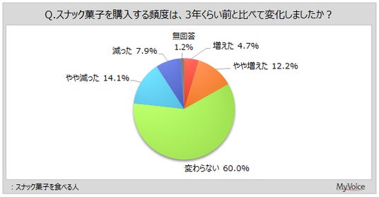 スナック菓子を食べる人に、3年前と比べて購入頻度が変化したかを聞きました。