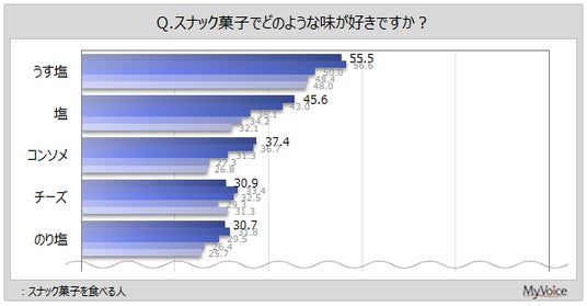 ■スナック菓子を食べる人が好きな味は「うす塩」が約56%、「塩」が約46%、「コンソメ」「チーズ」「のり塩」「ガーリック」が各30%台。過去調査と比べて、「塩」「コンソメ」が増加